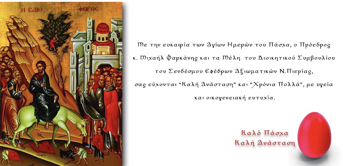 Ο πρόεδρος, το ΔΣ και τα μέλη του Συνδέσμου Εφέδρων Αξιωματικών Πιερίας εύχονται σε όλους τους Έλληνες Καλό Πάσχα . Ο Σταυρωμένος και Αναστημένος, για τον παθόντα άνθρωπο, Χριστός, ας δώσει σε όλους μας τη δύναμη για τη δική μας ανάσταση.